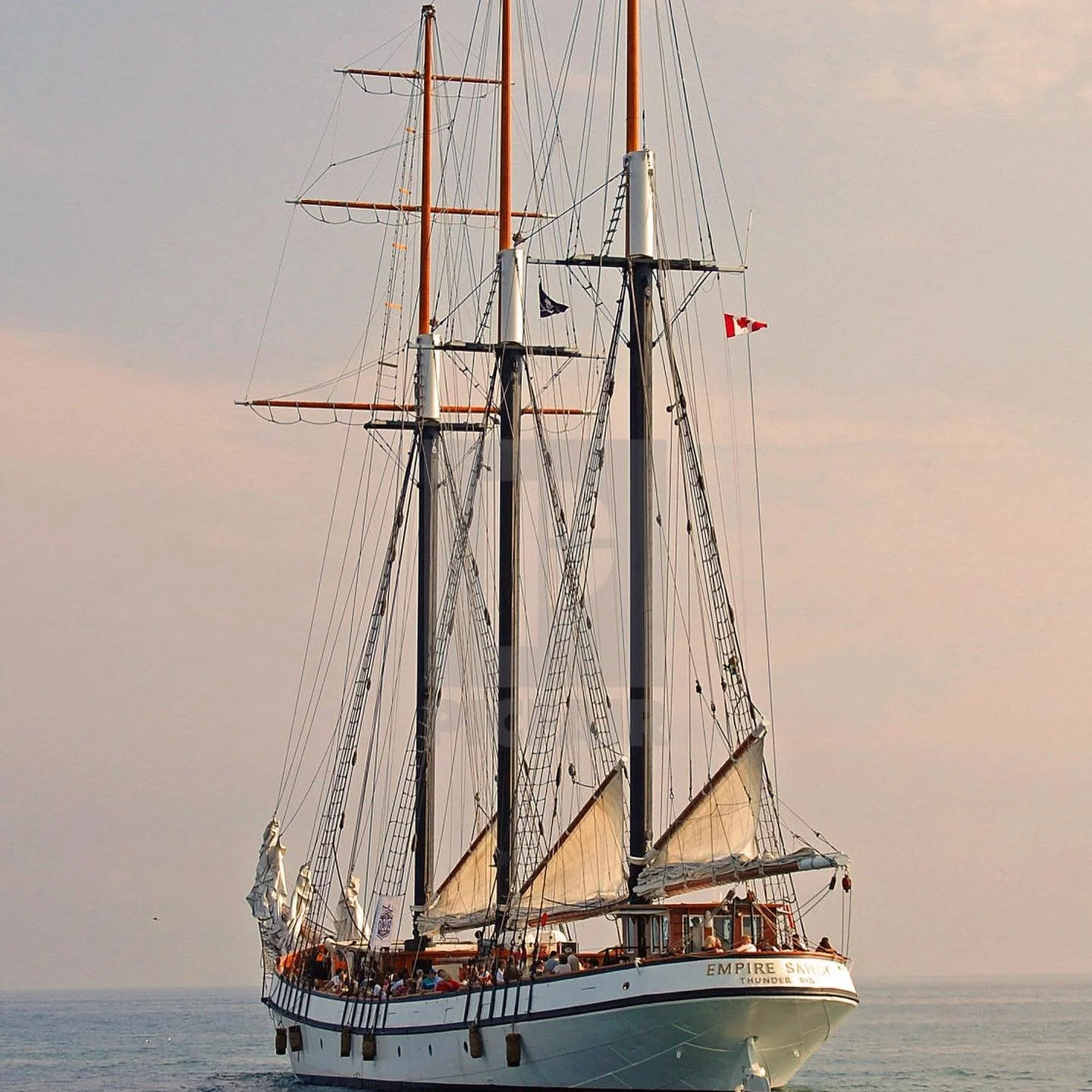 A large sailing ship with multiple masts and sails on calm water at sunset, with people visible on the deck and a flag flying at the stern.